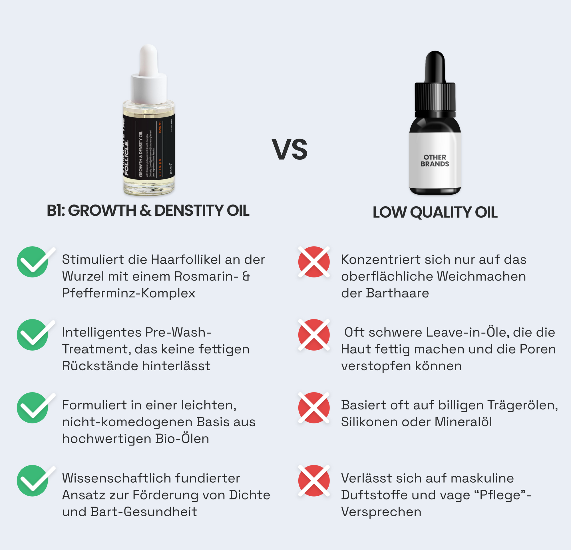 Die meisten Bartöle sind rein kosmetisch. Sie umhüllen das Haar mit Silikonen oder schweren Ölen, um es weicher erscheinen zu lassen, ignorieren aber die Biologie des Wachstums.