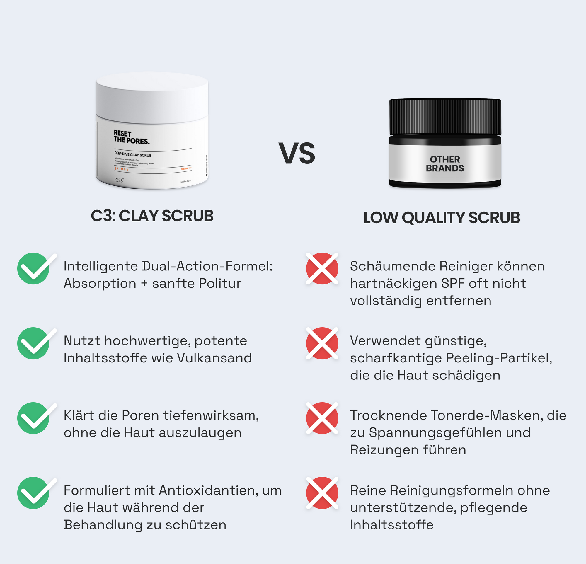 Unsere C3 Formel ist intelligenter. Wir kombinieren zwei Mechanismen in einem kontrollierten Prozess: Absorption und Politur. Die Tonerde leistet die Hauptarbeit, indem sie die Poren tiefenwirksam reinigt, während Sie sie einwirken lassen. Die feinen Partikel dienen dann im zweiten Schritt nur noch dazu, die bereits gelösten Zellen sanft von der Oberfläche zu "polieren".