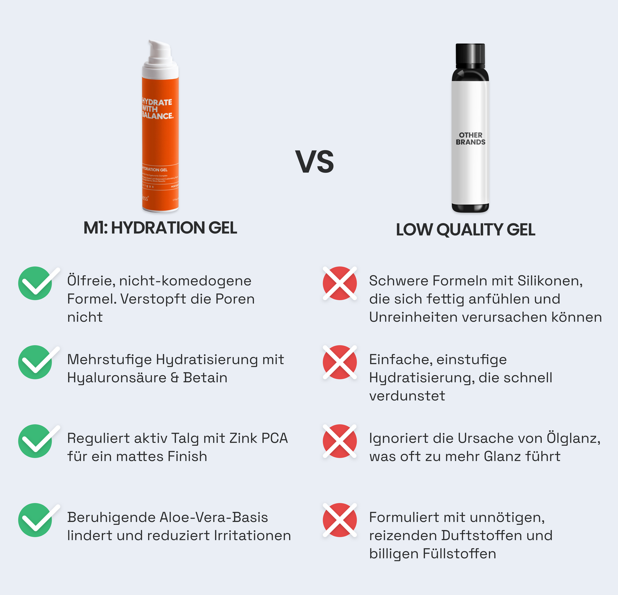 Unser M1 Gel löst dieses Problem durch intelligente Formulierung. Indem wir mehrstufige Hydratisierer mit einem talgregulierenden Wirkstoff wie Zink PCA kombinieren, schaffen wir ein Produkt, das tiefgehend hydratisiert und gleichzeitig der Haut signalisiert, weniger überschüssiges Öl zu produzieren.