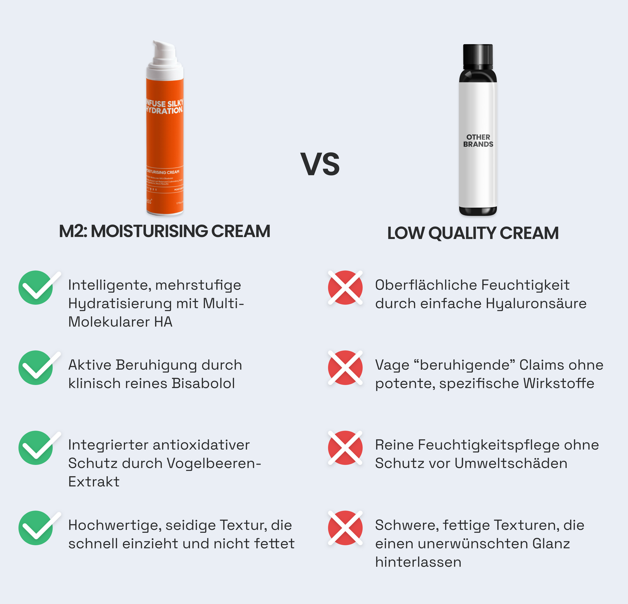 Unsere M2 Formel ist intelligenter konstruiert. Wir verwenden einen multimolekularen Komplex mit unterschiedlichen Molekülgrößen, der es der Hyaluronsäure ermöglicht, sowohl an der Oberfläche einen Schutzfilm zu bilden als auch tiefer einzudringen, um langanhaltende Feuchtigkeit zu speichern.