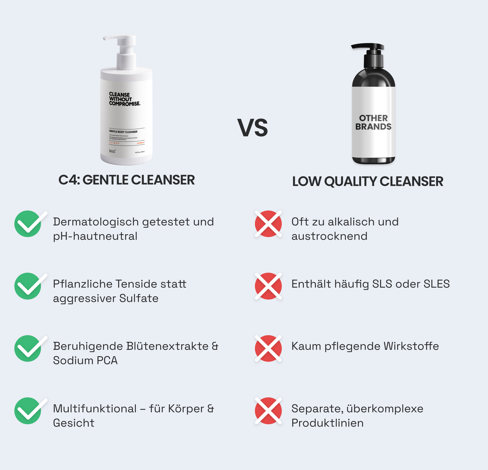 C4 wurde entwickelt, um diesen Fehler zu vermeiden. Die Kombination aus Coco-Glucoside und Cocamidopropyl Betaine schafft eine stabile, milde Reinigungsbasis, die selbst empfindlichste Haut nicht reizt.