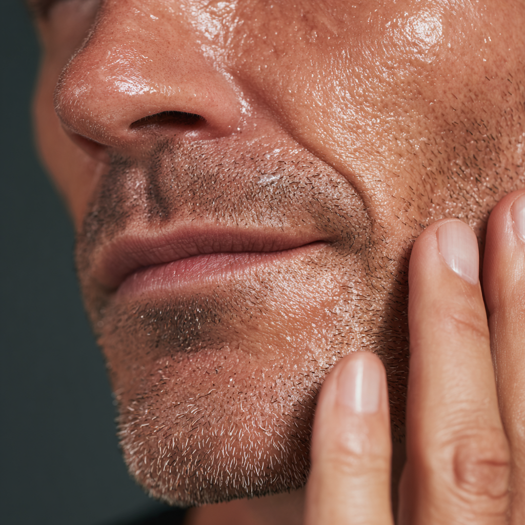 Haut unter einem Vollbart oder bei regelmäßiger Rasur ist besonderen Belastungen ausgesetzt. Reibung, eingewachsene Haare oder Mikroverletzungen können Irritationen verursachen. Diese Haut profitiert von Pflege mit antibakteriellen, entzündungshemmenden und stimulierenden Wirkstoffen – wie Rosmarinextrakt oder Niacinamid – um Bartwachstum zu fördern, die Haut zu beruhigen und die Follikel gesund zu halten.